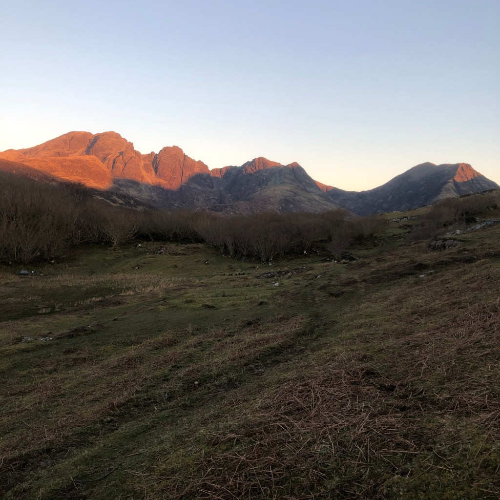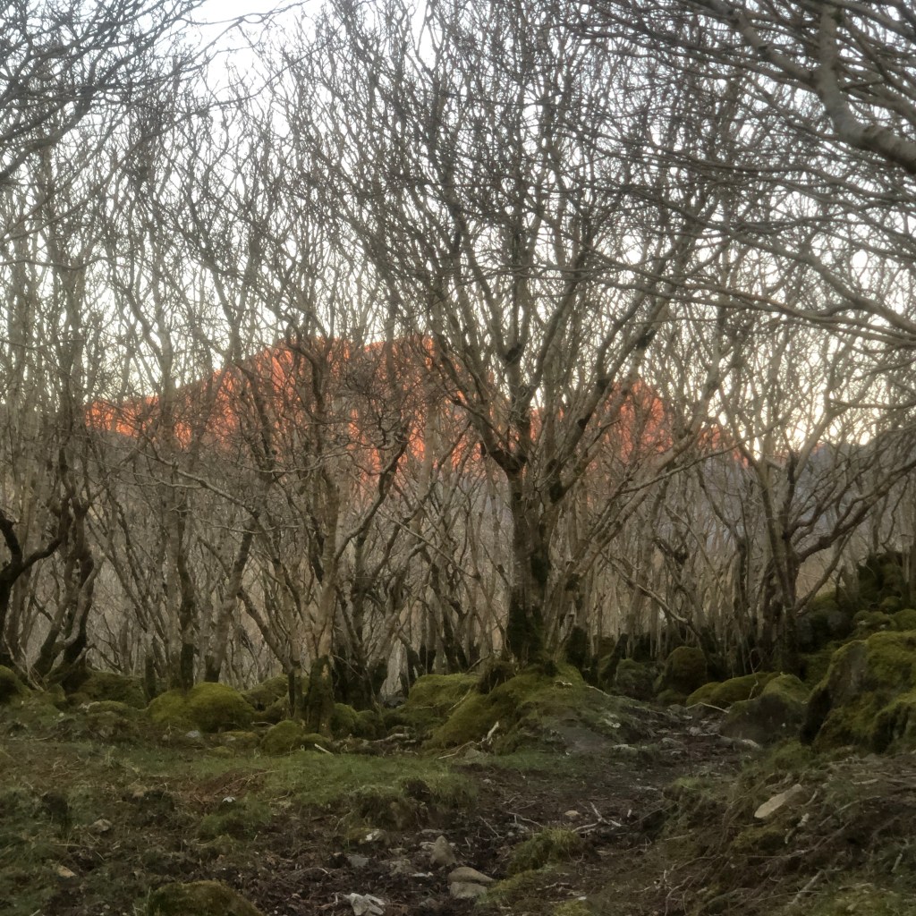 I slow down a bit now because I know there are a couple of Mallards nesting under neath the bank of a small stream. Also I try to keep quiet as this year most mornings I have stumbled into three hind deer. I don’t know they are there until they and I are both startled by each other and just as its registering to me they are there, all I can see is they’re white bottoms disappearing up the hillside. After walking along the road for 5 minutes I come to the first, mostly hazel and birch, small, wind battered trees which are now covered in catkins. I love this time of year! After the winter months everything is stirring, you can see, feel, touch and sense it through every fibre of your being – I don’t want to miss any of it, this is why it is my morning ritual! The path through the forest opens up to a wide expanse of shoreline – grassy bank, rocks and sand. When the tide is out the sand stretches a long way out, all the way to two small island which are often inhabited by shags and seals, nestled on seaweed covered rocks. I don’t rush this part of my walk but smell the sea air, watch the ebb and flow of the sea, seagulls above and oyster catchers walking around on the sand. Continuing on the walk (a well worn sheep path) up the hillside and into another forest again, mainly hazel and birch. It’s a slippy muddy path so taking my time, I’ve had numerous incidents of slippage in the past! It takes longer to walk through this forest, it’s darker in here, the forest is more dense, lots of hidden areas, big rocks, streams. It will be full of fungi in a few moths time. I see one primrose. More light starts to filter through as I walk towards the edge of the forest and then I’m out onto the hillside. Magnificent mountains loom up, dark craggy ones in front and red rotund (breast like) mountains on the right side. The ground is dryer here and I’m walking through Clint’s and Grykes and heather. Rabbit holes everywhere. Islands in the distance. Looking across to the left is the sea, a few local fishing boats bobbing up and down. Continuing on, clambering over a coupe of fences and then making my descent down the hillsides towards the main road. There are a couple of holiday houses visible now, cars outside and I wondered for a moment about the people staying there. Back on the main road I turn right and walk up the road back towards my house. I observe each house as I pass it, the local cafe, the trees, the sheds/barns, the verges, the birds, everything that is going on. This is at the steepest part of the walk, a bit of a puff and a pant but I find myself back at my gate. Usually I will across the road briefly to check if there are any eggs in the fridge at the side of the road with eggs for sale. Then once back in my own domain I will nip into my studio, switch the heating on, back into the house, shower and then I’m ready for the day ahead, ready to be creative.