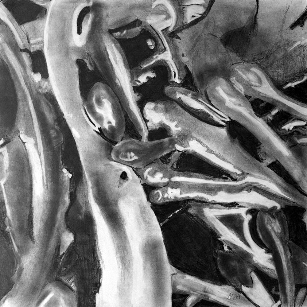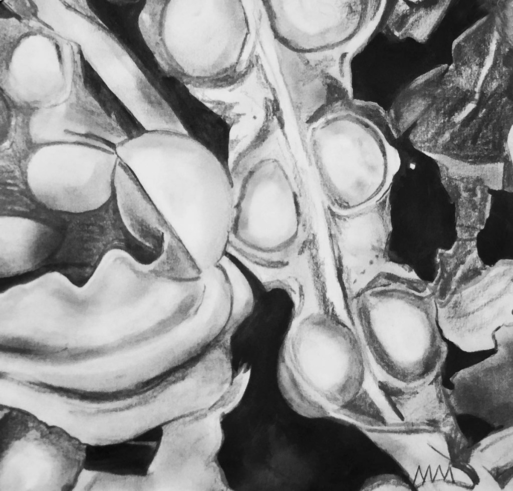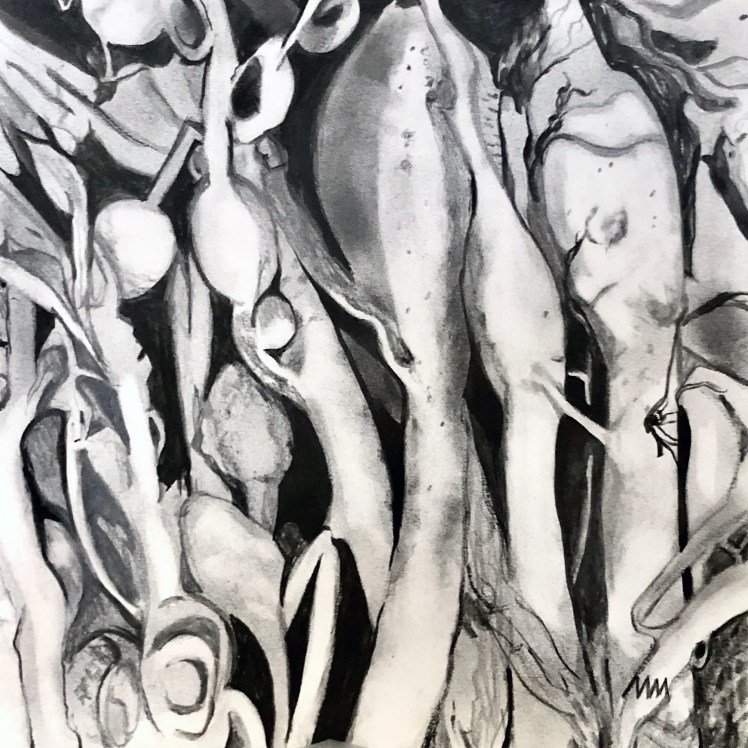 A collection that explores the intricate relationships within the natural world, spanning the depths of the sea to the life that flourishes on land. Each drawing exists in its own quiet space, while also forming part of a broader conversation—one that interweaves sea, air, and earth. Studies of seaweed hold a delicate balance between stillness and motion, while detailed renderings of flora and organic forms reveal inner structures and natural rhythms. As the work shifts toward abstraction, fluid shapes and softened outlines echo nature’s constant movement. These drawings offer a space to pause, observe, and reflect on the subtle threads that bind all living things.